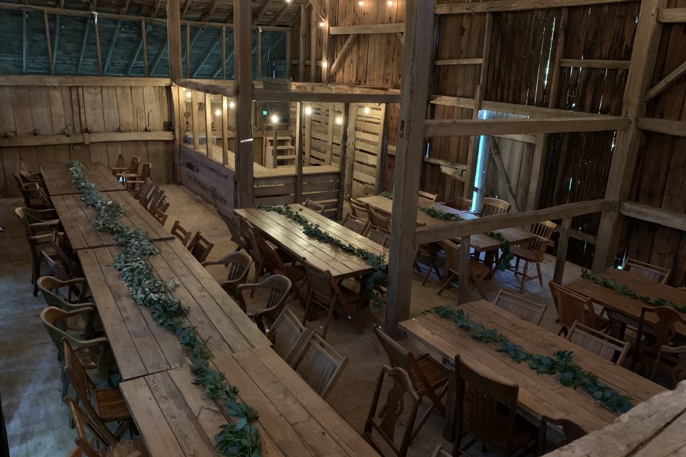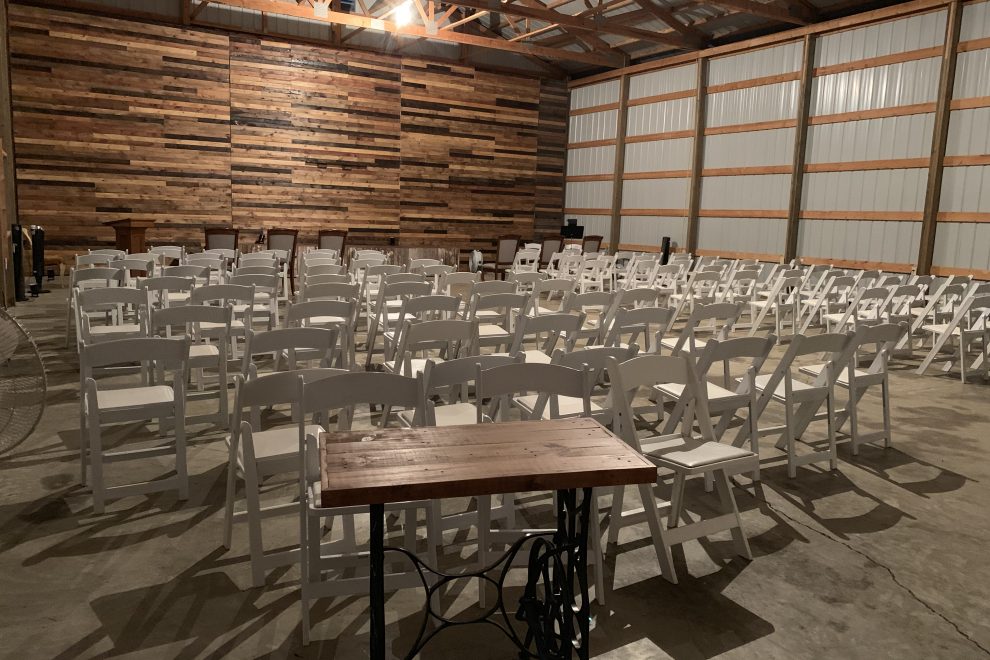 Kathleen and Cory were married in September. They booked both the sheds with the inclusive package. Their ceremony was held in the Back Shed on stage with spotlighting and uplighting for the guests. The guestbook table was made from a vintage sewing machine station.