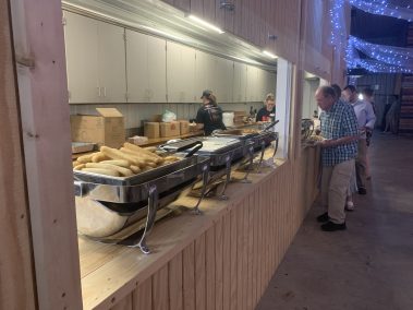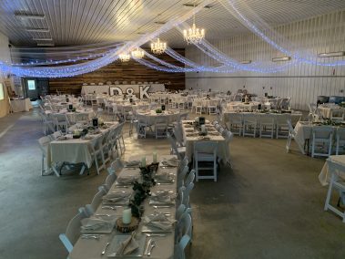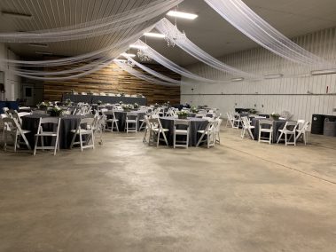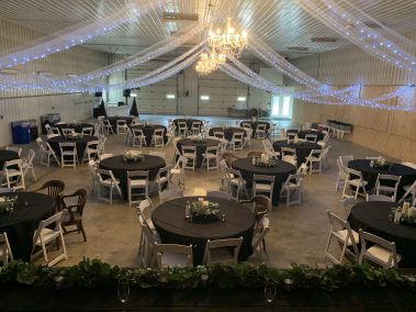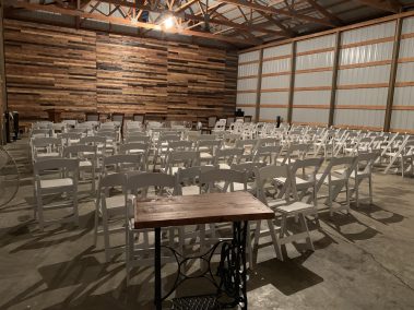 The Sheds at Clover Ridge offer an indoor, climate controlled experience. The Front Shed is insulated at 60×100 and has a capacity of 300 and offers heating, air conditioning, sink, serving space, refrigerator, warmer, and restrooms. The Back Shed is not insulated and is 40×60. Both sheds have a stage area with wood backdrop. The Back Shed may be used for happy hour or ceremony space. Renting this space includes a crushed rock area for parking, white folding chairs, round and rectangular tables. Also included is ample fenced green space with an orchard and flower beds.